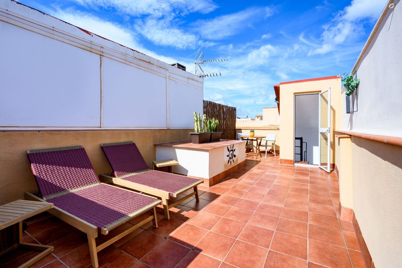The apartment features an independent bedroom, a cozy living room, a fully equipped kitchen and an impressive solarium-style terrace, ideal for enjoying the sun, relaxing outdoors or sharing pleasant moments during your holidays.